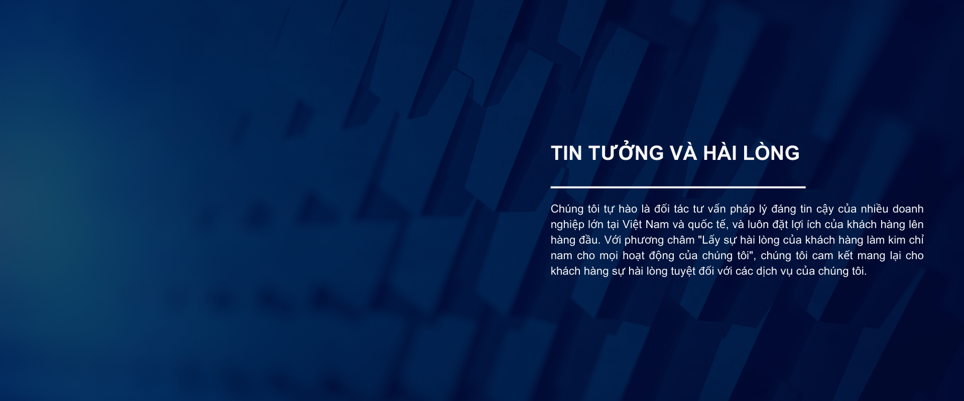 Chúng tôi cung cấp các giải pháp và tư vấn pháp lý cho các khách hàng tư nhân và doanh nghiệp trong và ngoài nước có trụ sở hoặc có lợi ích kinh doanh tại Việt Nam. Chúng tôi được ghi nhận vì cam kết cung cấp dịch vụ tốt nhất cho khách hàng và mong muốn hỗ trợ khách hàng trước những thách thức pháp lý phức tạp và khắt khe. Trong mọi việc chúng tôi làm, chúng tôi cố gắng vì sự chính trực và duy trì các tiêu chuẩn cao nhất trong nghề nghiệp của mình để phục vụ khách hàng.